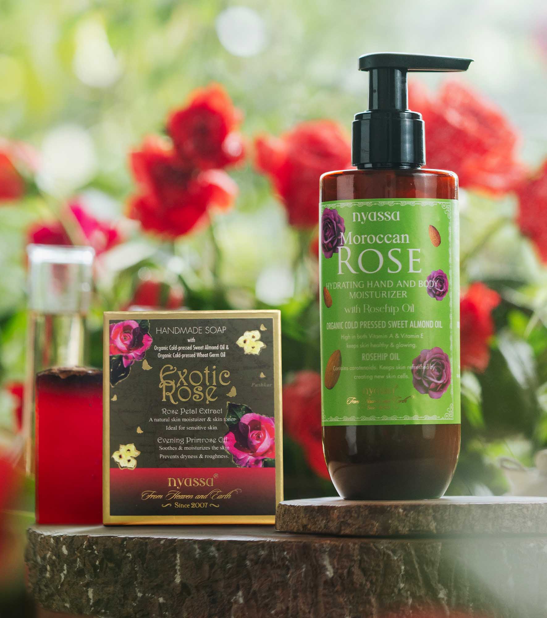 "The Nyassa Exotic Rose Handmade Soap has a luxurious, natural rose fragrance and leaves skin soft, hydrated, and refreshed—perfect for a soothing, indulgent bath experience!