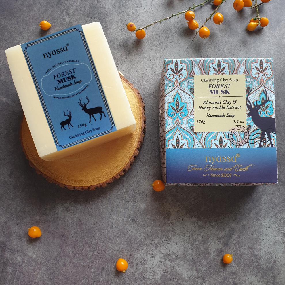 Active Base is an exclusive and unique blend of six pure and natural carrier oils, essential oils and extract that goes into every Nyassa handmade soap, namely Aloe Vera Extract, Grape Seed Extract, Honey Extract, Cold-Pressed Sweet Almond Oil, Cold-Pressed Wheatgerm Oil, and Vitamin E. These ingredients work best as Moisturizers, Healers and Soothing agents. Rhassoul Clay - Acts as a skin cleanser, detoxifier, and an excellent natural toner. It also helps improve your skin appearance. This beauty soap is loaded with the goodness of Honey Suckle that help in nourishing and softening your skin in a manner that's gentle and natural.
